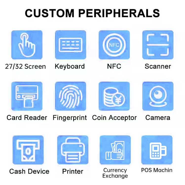 Pièces facultatives:Lecteur de carte, Scanner, Caméra, Lecteur de code-barres, Solution pos, Lecteur de carte d'ic, Scanner d'empreintes digitales, Scanner de code de qr, Imprimante de Code à barres, Imprimante a4, Lecteur de carte électrique, MSR