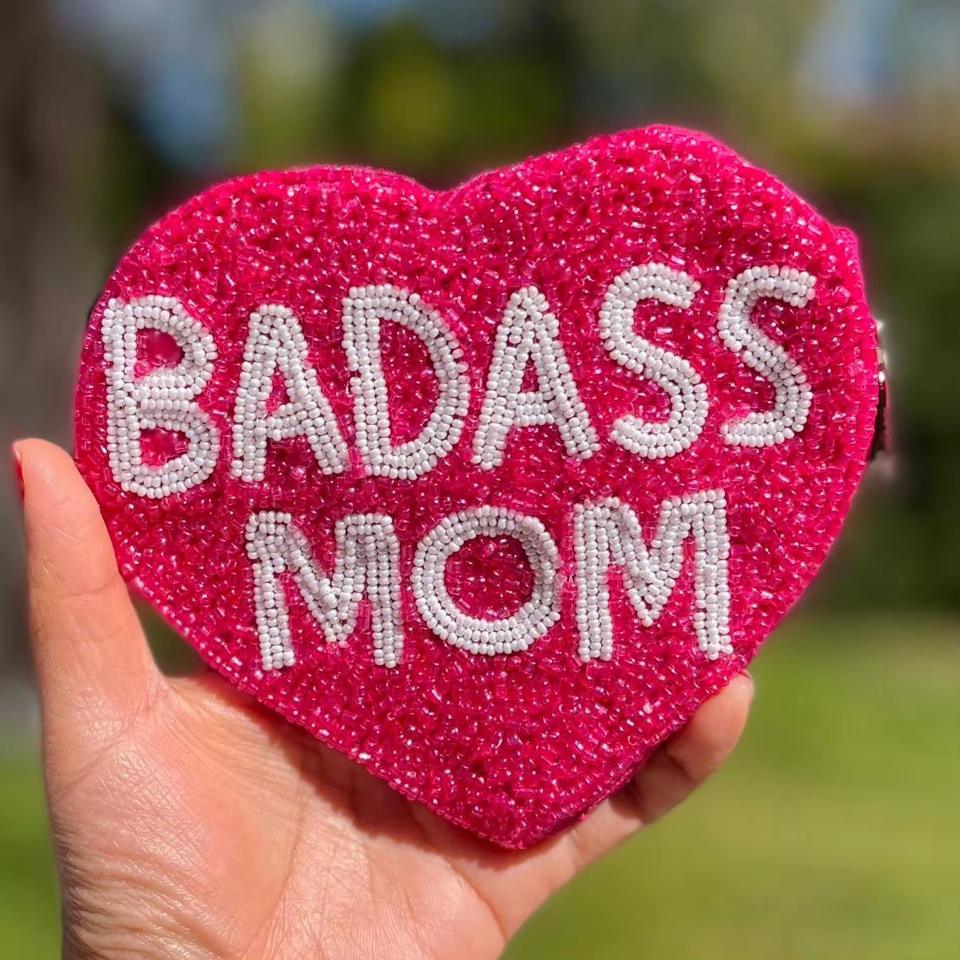 Pochette à monnaie en velours perlée personnalisée Crystal Craft BADASS MOM avec perles de verre, broderie artisanale, couleur et taille personnalisées