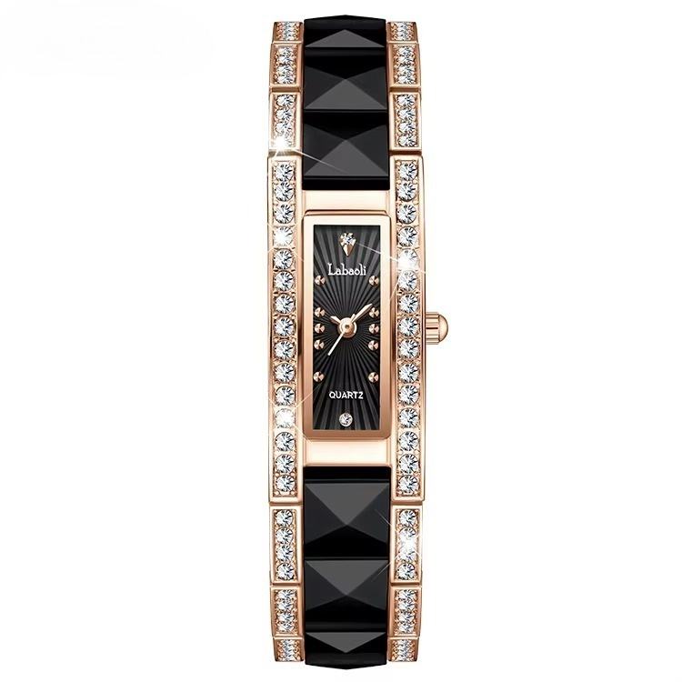 Crystal Encrusted Rectangular Steel Band Watch 18mm Delicate Small Dial Rose Gold Ceramic Case Waterproof Women's Quartz Watch