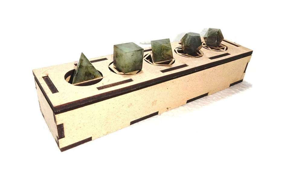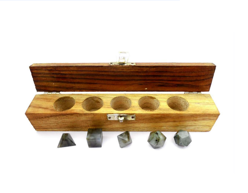 Ensemble de 5 pièces en labradorite cristalline géométrique avec boîte, pierre naturelle sacrée sculptée pour la guérison, solides platoniques, formes géométriques uniques