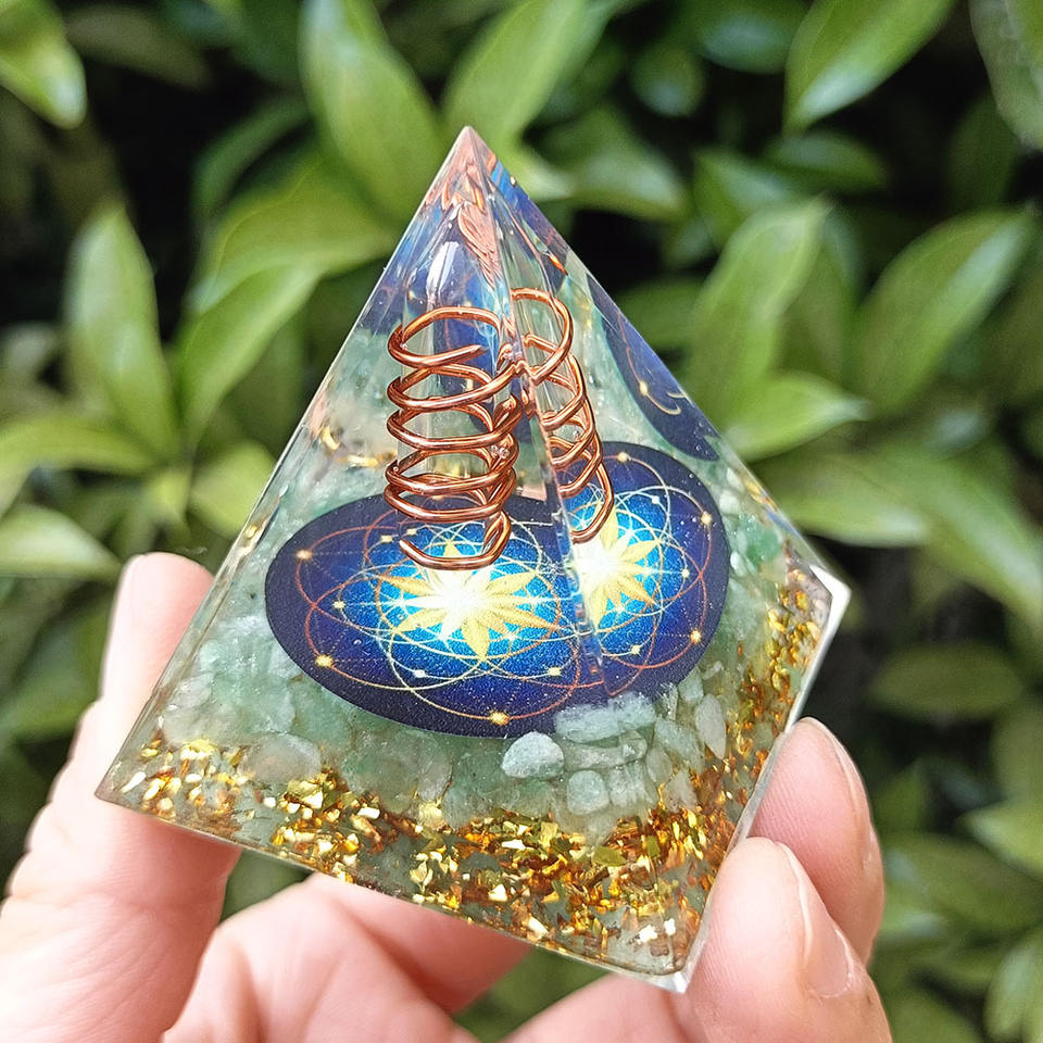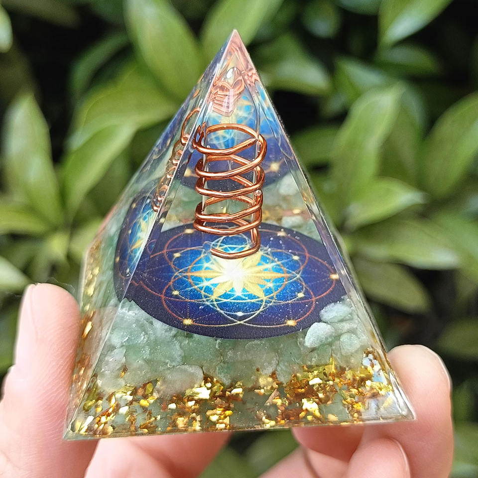 Pyramide en résine époxy avec galets de cristal, ornement de bureau artisanal, 5 cm, vert aventurine transparent, fleur bleue, décoration florale, cadeau