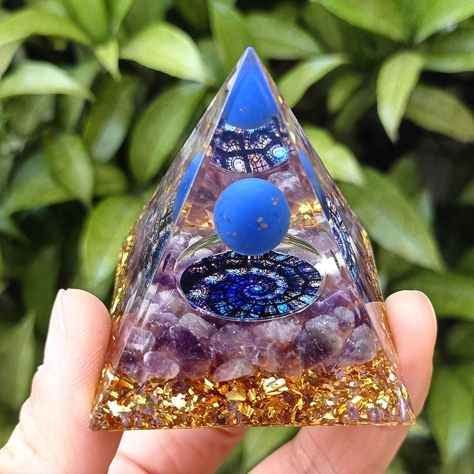 Pyramide en résine de galets de cristal, ornement de bureau artisanal en époxy, décoration d'aquarium, sphère de lapis-lazuli, vortex d'améthyste, cadeau