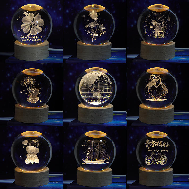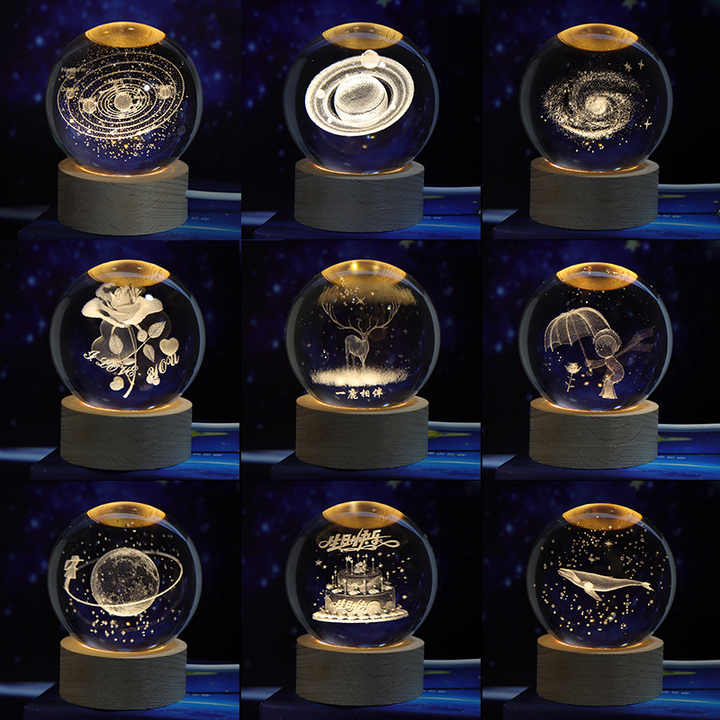 Sphère de Cristal Système Solaire Gravée au Laser 3D, Boule de Cristal Galaxie avec Socle Lumineux LED en Bois pour Décoration Intérieure et Cadeaux