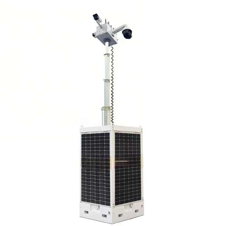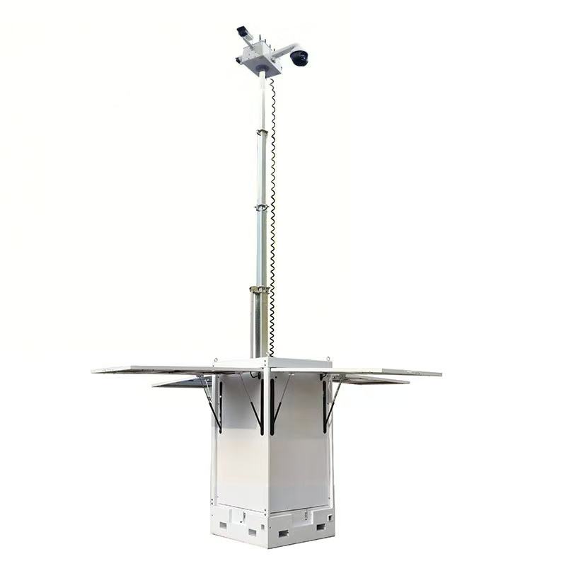 Tour de vidéosurveillance solaire Cube avec mât de 6 m, 4 panneaux de 440 W et 4 anneaux d'antenne cellulaire pour la surveillance de la sécurité publique