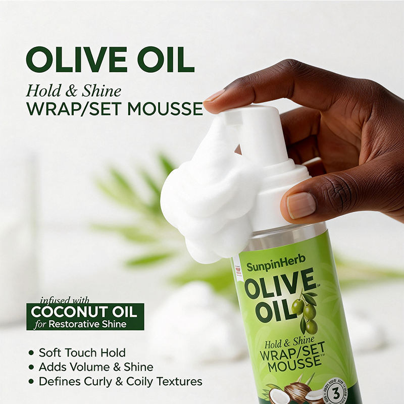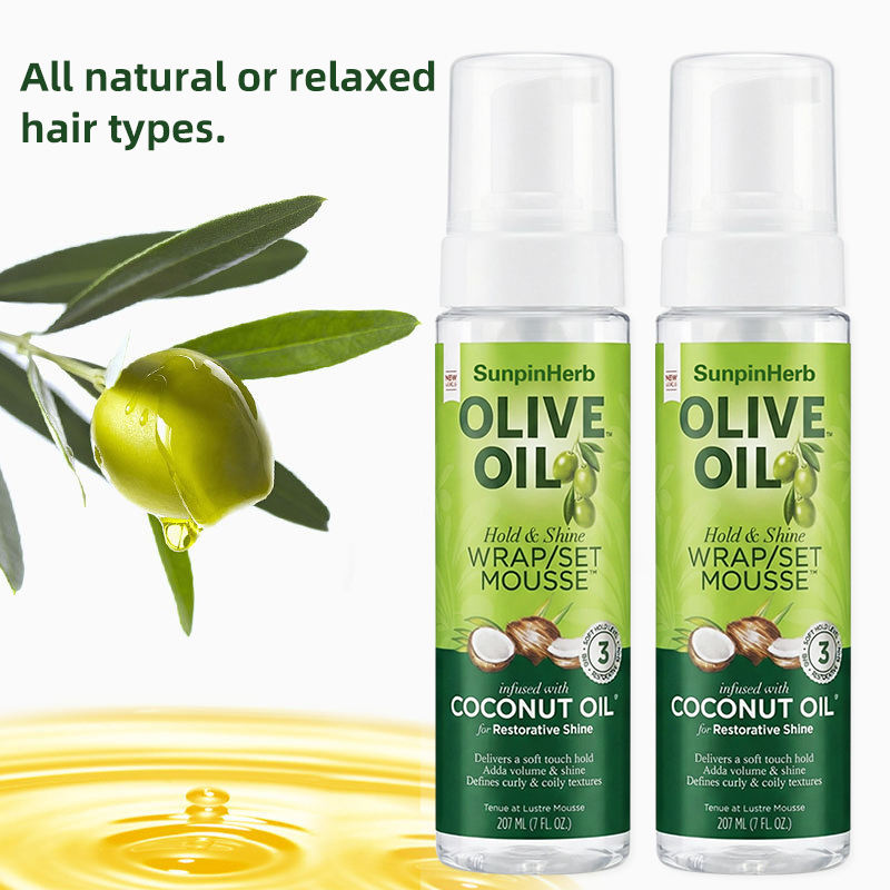 Kit de coiffage pour boucles : Mousse légère à l'huile d'olive et de noix de coco, ajoute du volume et de la brillance sans résidus