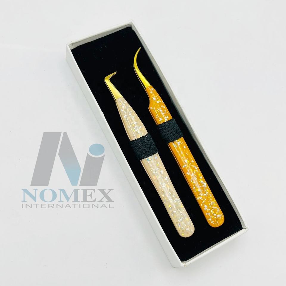 Customized Color L-Type 90 Degree Curved Eyelash Tweezers Solid Diamond Grip Gold Plated Points Stainless Volume Lash Extension