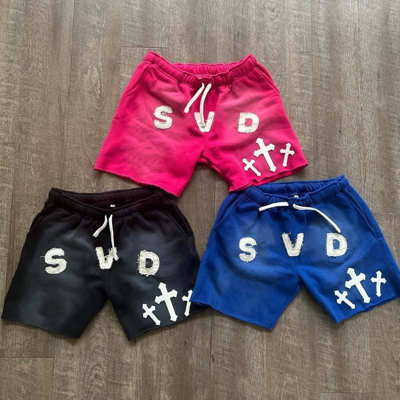 Custom 100% Cotton Men's Vintage Drawstring Plus Size Shorts Solid Pattern Distressed Embroidery Patch Casual Stone Acid Wash