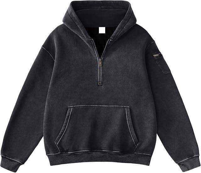 Sweat à capuche homme personnalisé 100% coton, fermeture éclair quart, délavage acide, style vintage, coupe oversize, molleton épais 300g, streetwear hiver