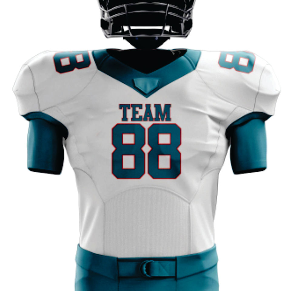 Uniforme de football américain sublimé en polyester 100% personnalisé, matériel d'équipe en sergé blanc sarcelle respirant, maillot court à l'avant