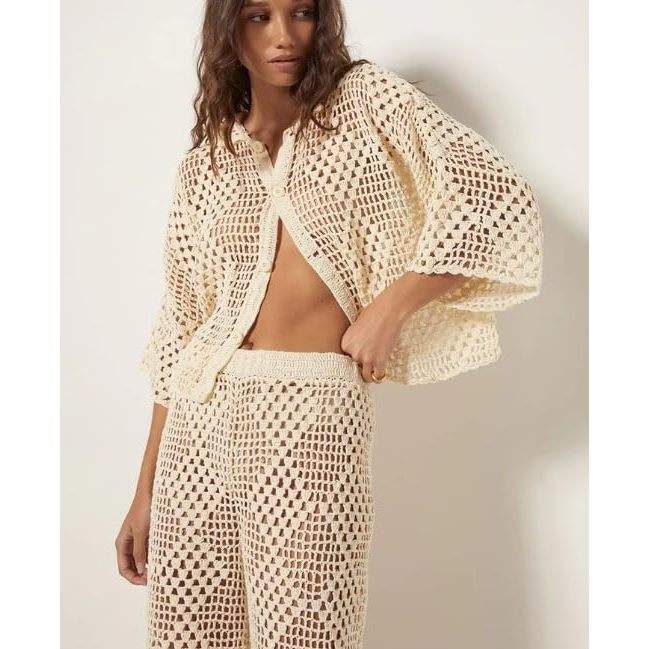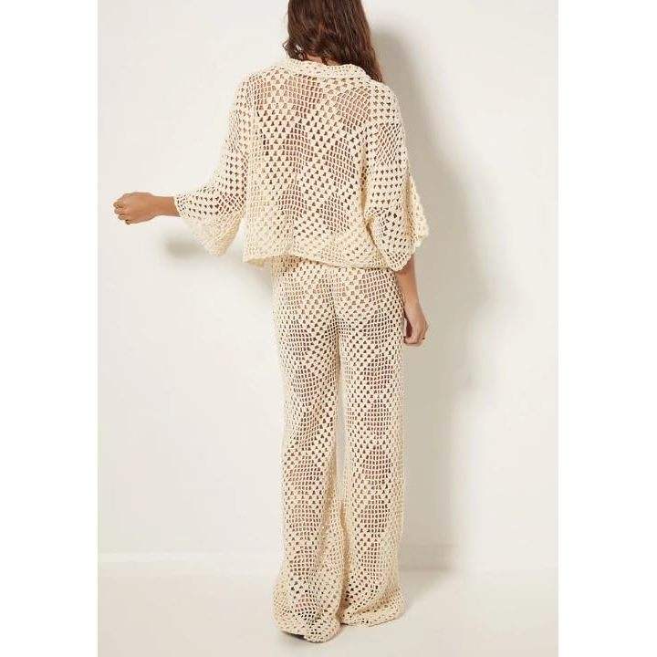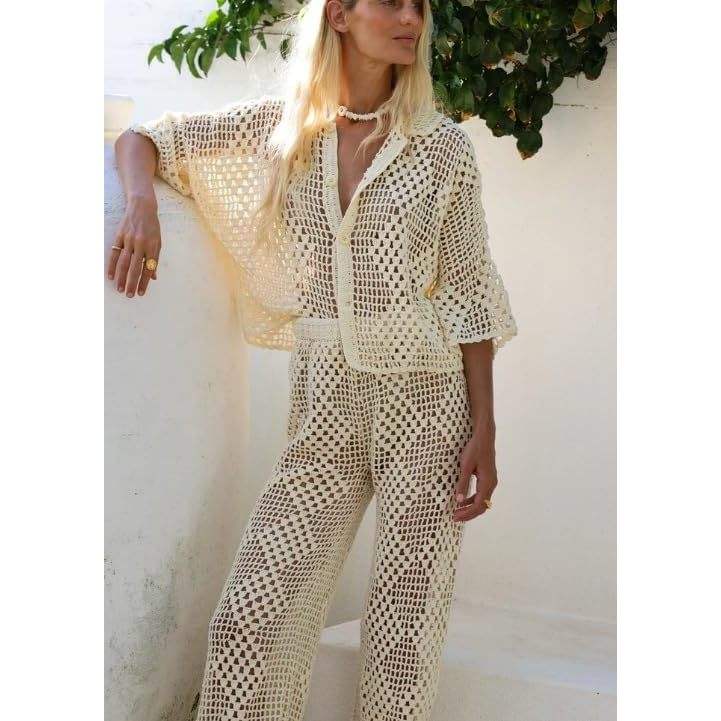 Ensemble deux pièces au crochet personnalisé 2026 pour femme – Chemise ajourée en maille bohème et pantalon large respirant pour les vacances d'été