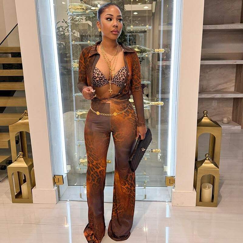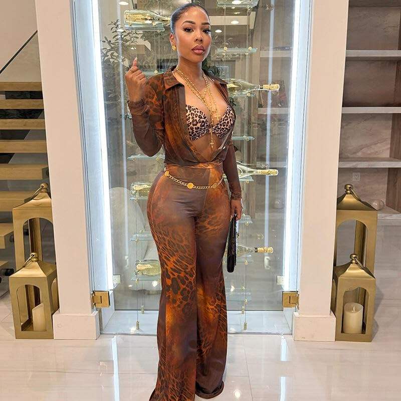 Voikerdr Ensemble deux pièces en maille imprimé guépard pour femme, col en V, transparent, moulant, tenue de club