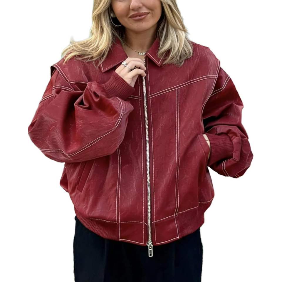 Blouson Moto en Cuir Rouge Personnalisé 2026 pour Femme, Veste Zippée Coupe-Vent d'Automne à Manches Longues en Tissu Tissé