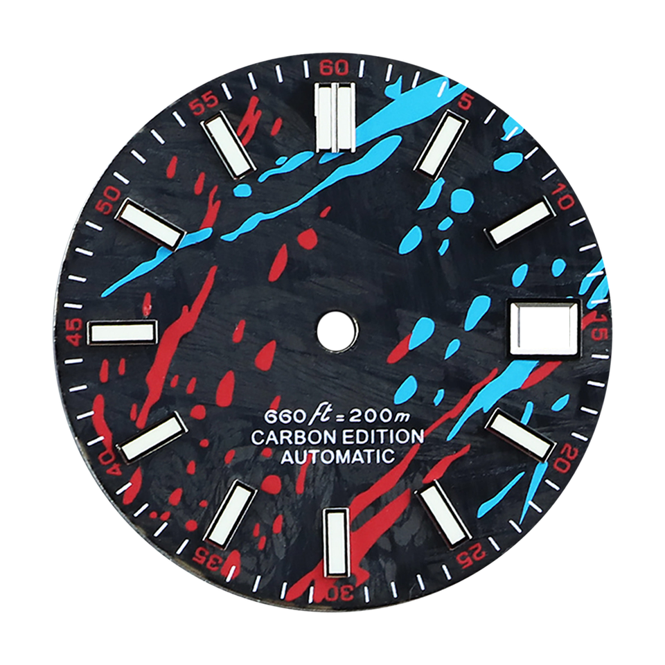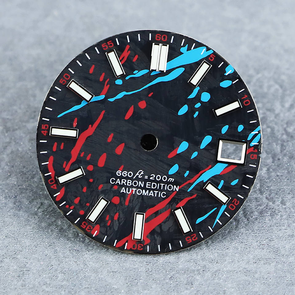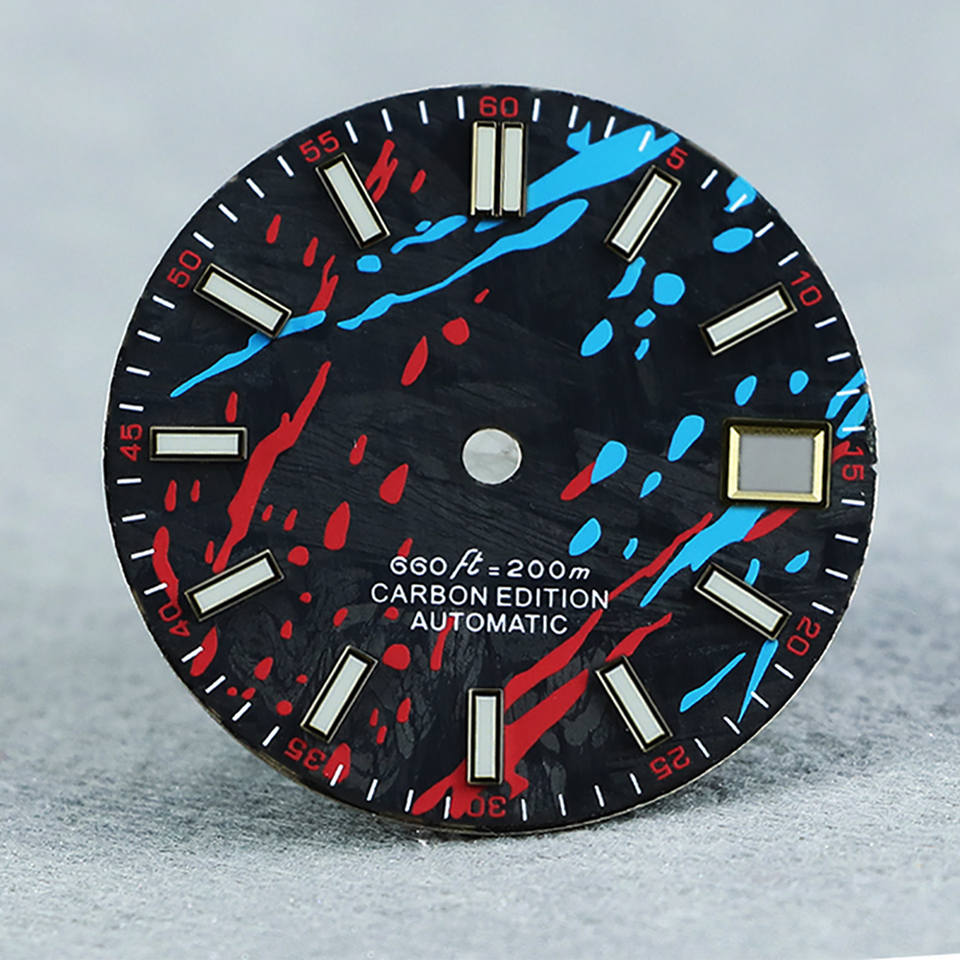 Cadran de montre personnalisé en fibre de carbone de 28,5 mm, encre colorée bleue, cadran lumineux pour mouvement NH35 NH36