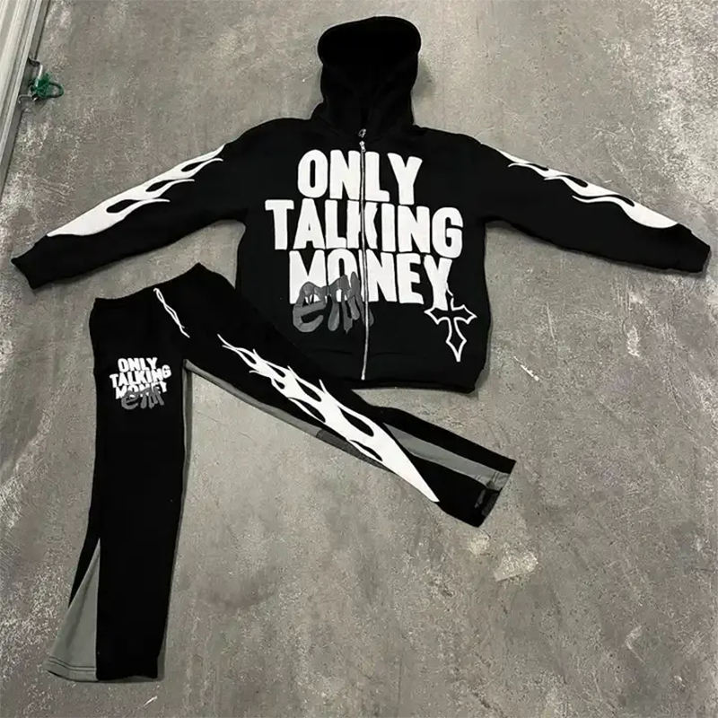Ensemble de survêtements personnalisés 2 pièces imprimés avec fermeture éclair, broderie délavée à l'acide, appliqué, patch, pantalon évasé et sweat à capuche unisexe 100% coton respirant