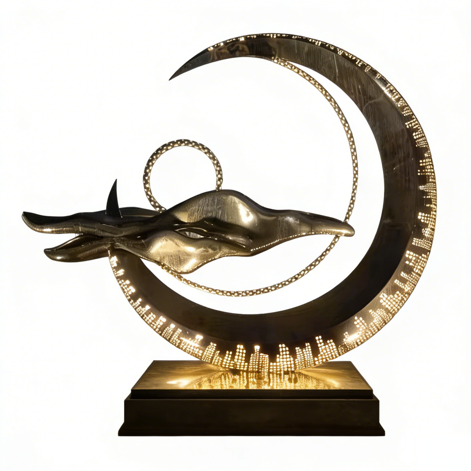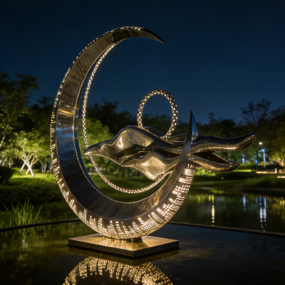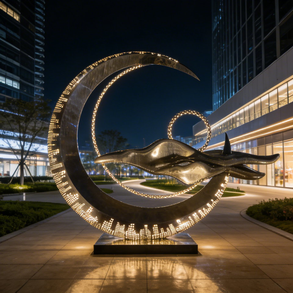 Sculpture personnalisée en acier inoxydable 316L LED en forme de croissant de lune - Art métallique lumineux Ciel et Baleine pour la décoration municipale