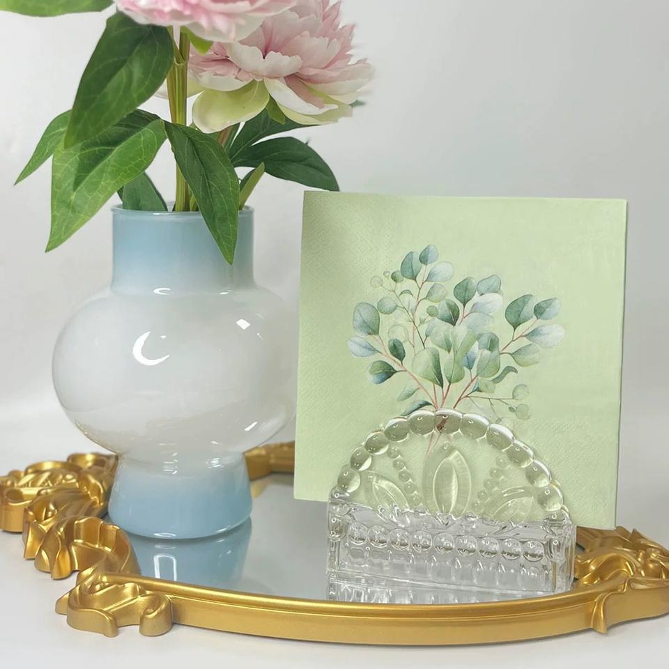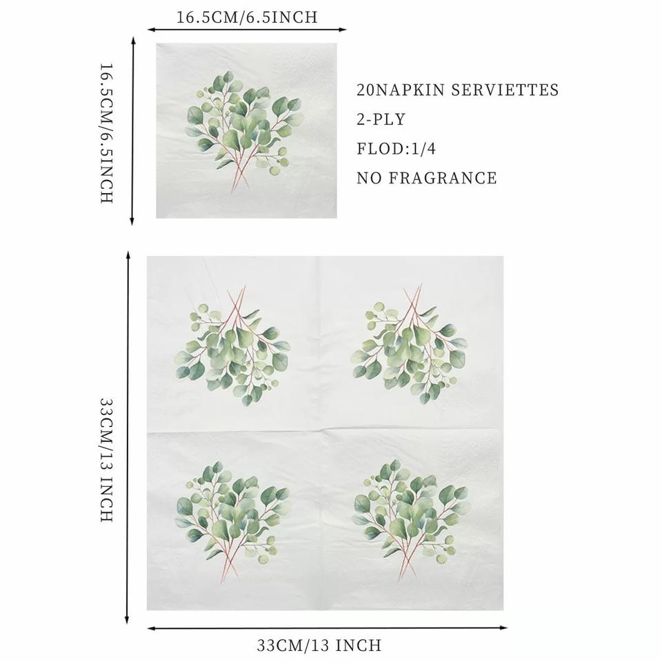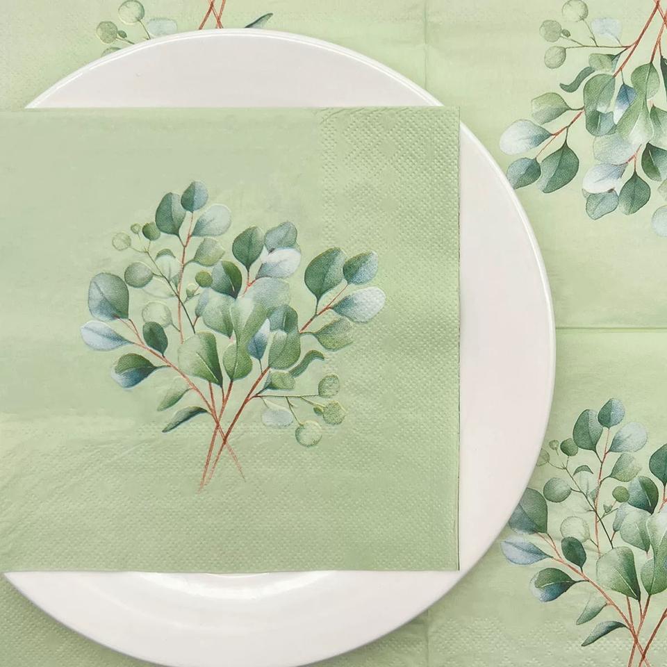 Serviettes de table personnalisées 33*33 imprimées en 2 plis, en pâte de bois vierge, série verte fraîche, motifs d'arbres et de fleurs, style sac, papier 4 plis