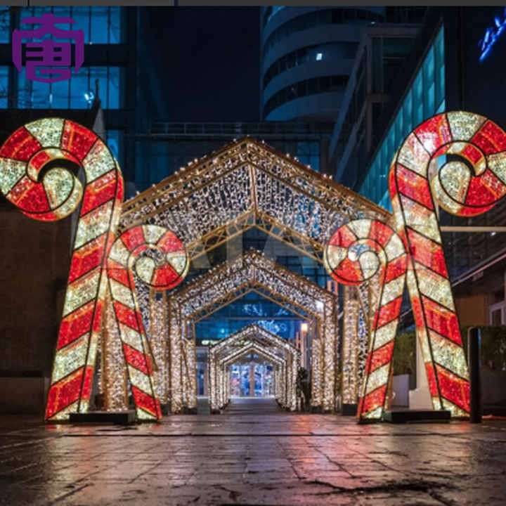 Installations d'arches d'entrée extérieures LED 3D personnalisées en forme de canne à sucre pour Noël, IP65, pour parcs à thème, stations balnéaires, places de ville, style moderne