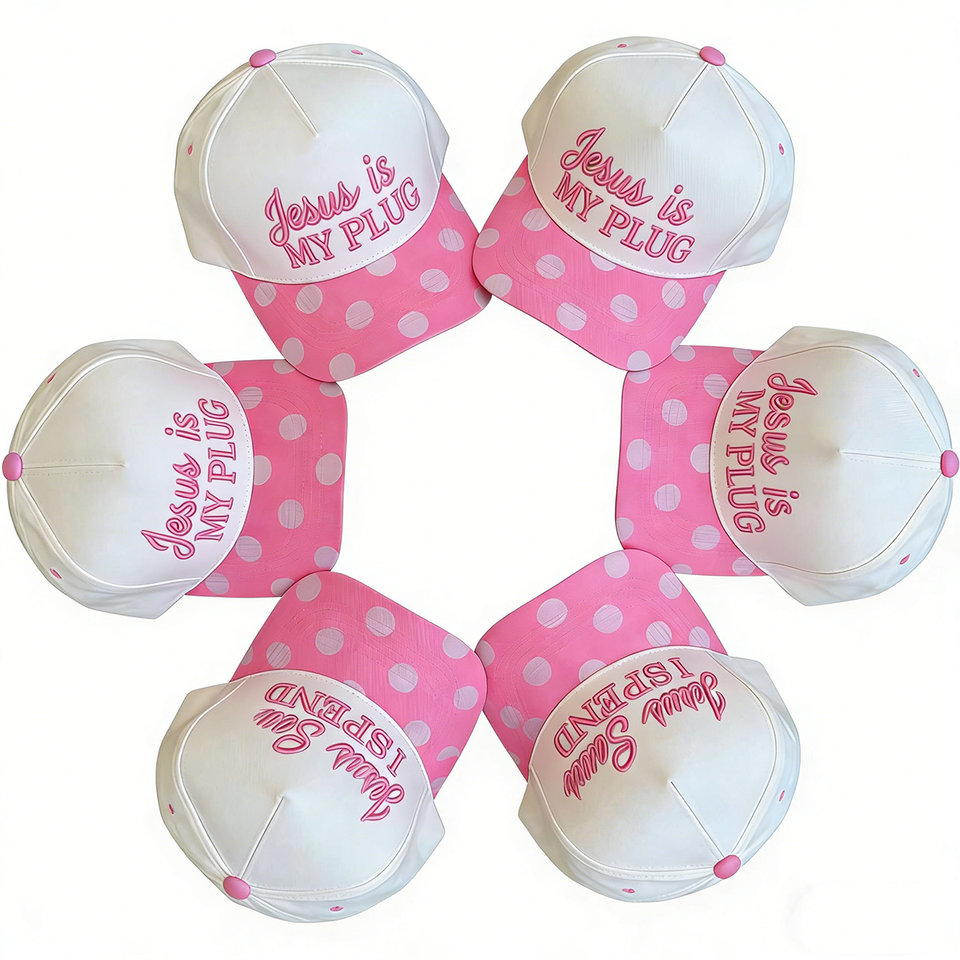 Casquette structurée à 5 panneaux avec broderie 3D personnalisée, couronne moyenne, rose et blanc à pois, visière de baseball pour le streetwear quotidien hip-hop
