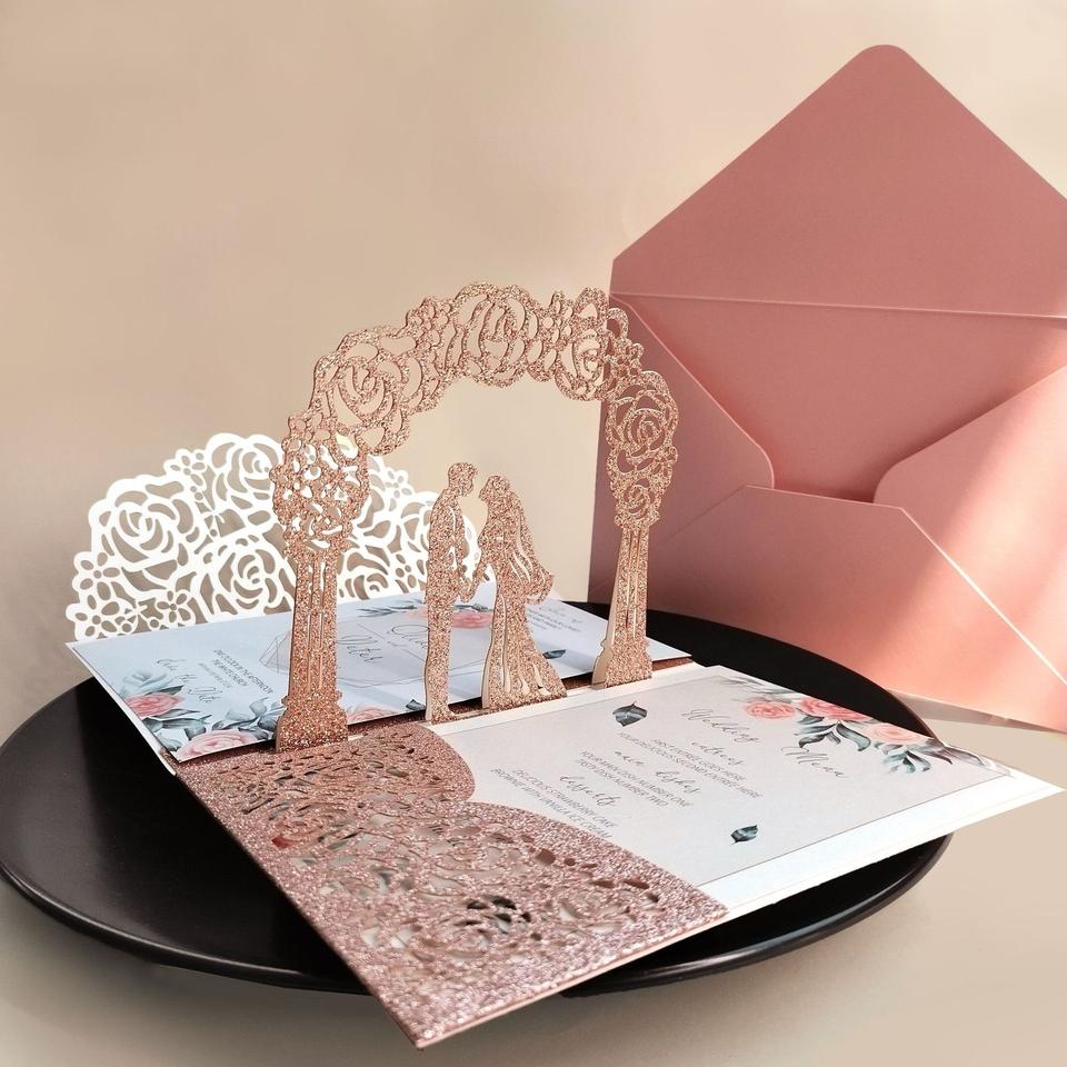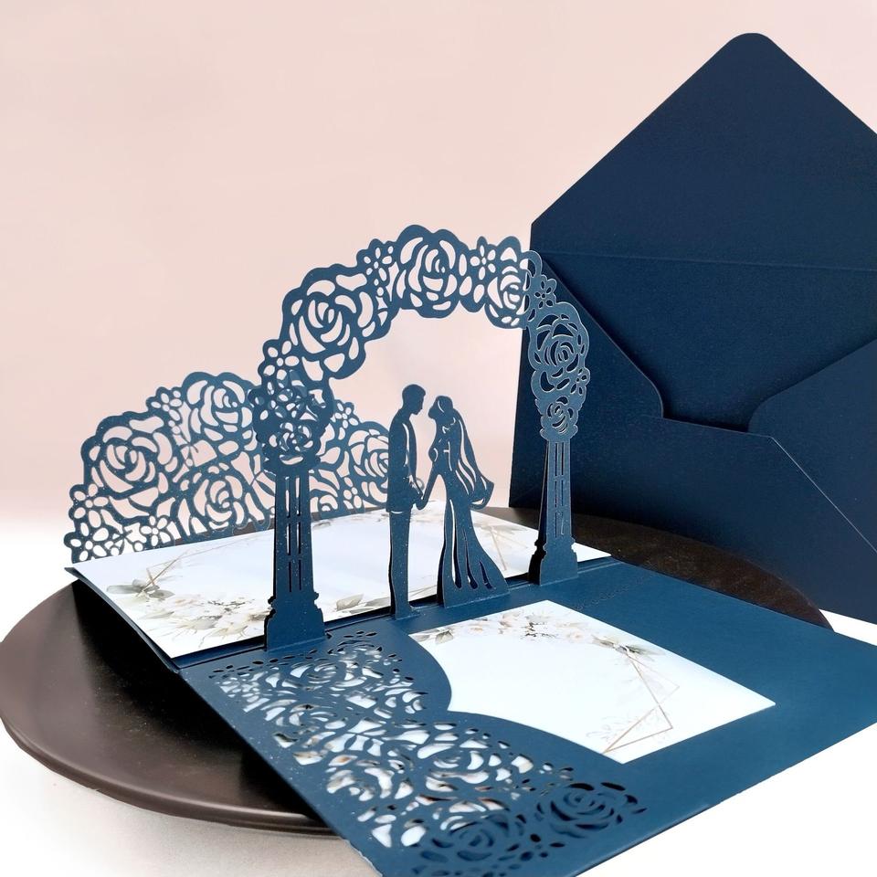 Cartes d'invitation de mariage personnalisées découpées au laser 3D en papier écologique avec ruban fait main et enveloppes pour la fête des mères