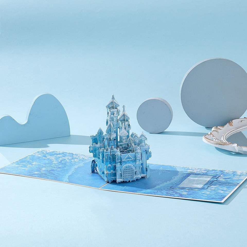 Carte de vœux personnalisée en 3D avec château bleu de rêve, enveloppe et message