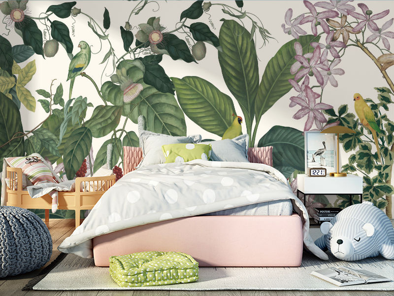 Peinture murale imperméable à l'eau imprimée en 3D personnalisée Peel & Stick Tropical Jungle Plante Arbre Feuille Floral Léopard Oiseau Design pour chambre à coucher