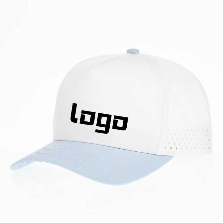 Casquette de golf structurée personnalisée avec impression 3D en relief, blanche et bleue, en polyester à carreaux, visière incurvée, perforations laser, fermeture snapback, vente en gros