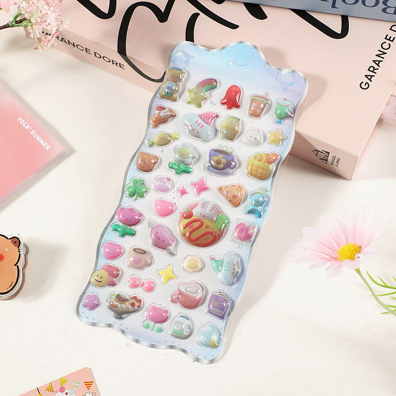 Autocollants décoratifs en PVC 3D en relief personnalisés, imperméables, écologiques, imprimés en couleur CMYK, avec laminage mat, effet bulles gonflées, bonbons