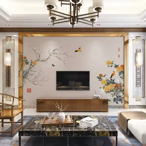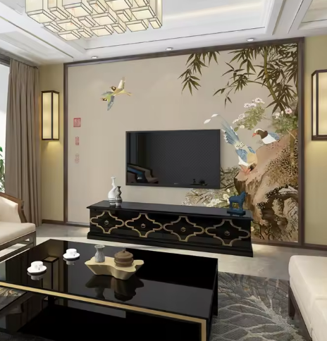 Papier peint mural en soie personnalisé imprimé en 3D, feuille de plante, oiseau volant, fleurs, montagne, chinoiserie, style de peinture chinoise