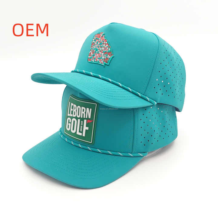 Casquette de baseball personnalisée à 5 panneaux, imperméable, perforée, avec trous découpés au laser, logo en patch PVC caoutchouc, en polyester vert, avec cordon de golf