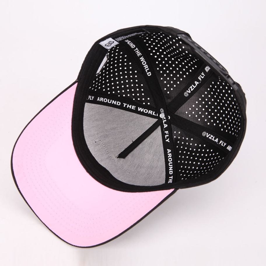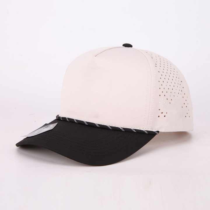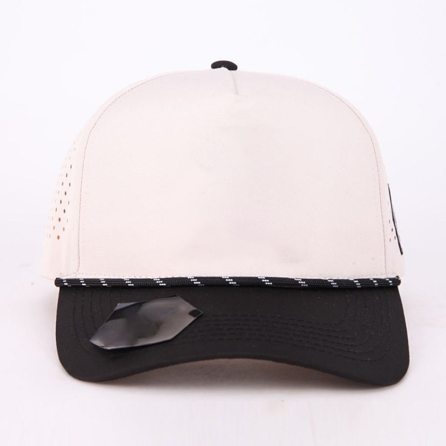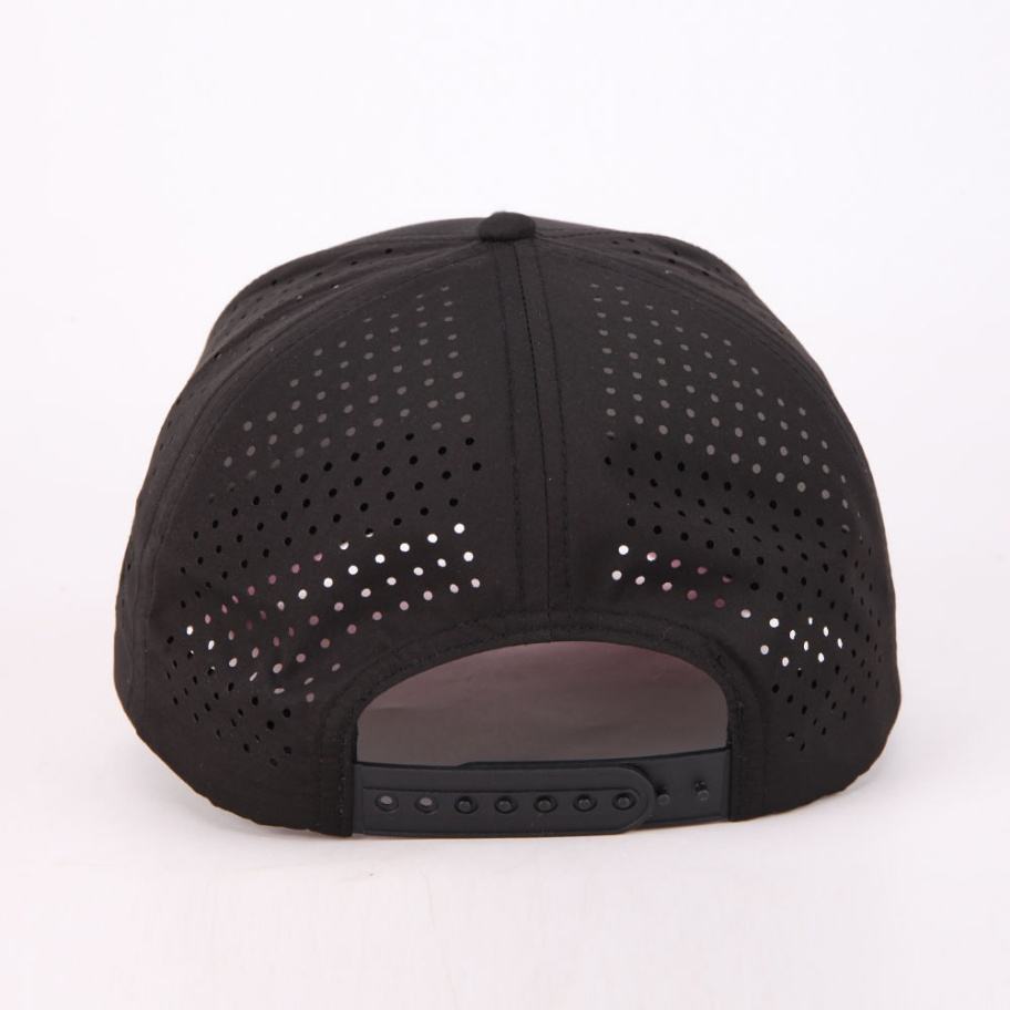 Casquette de baseball sportive personnalisée à 5 panneaux en polyester imperméable avec perforations découpées au laser et patch en caoutchouc pour le golf