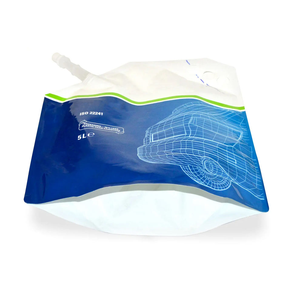 Sac d'emballage liquide en aluminium personnalisé de 5 L avec bec verseur long, debout, certifié ISO 22241, impression en héliogravure