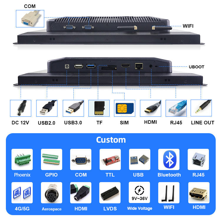 Moniteur industriel Android personnalisé avec écran tactile 10 points de 7/8/11,6/13,3 pouces avec interfaces USB/DVI