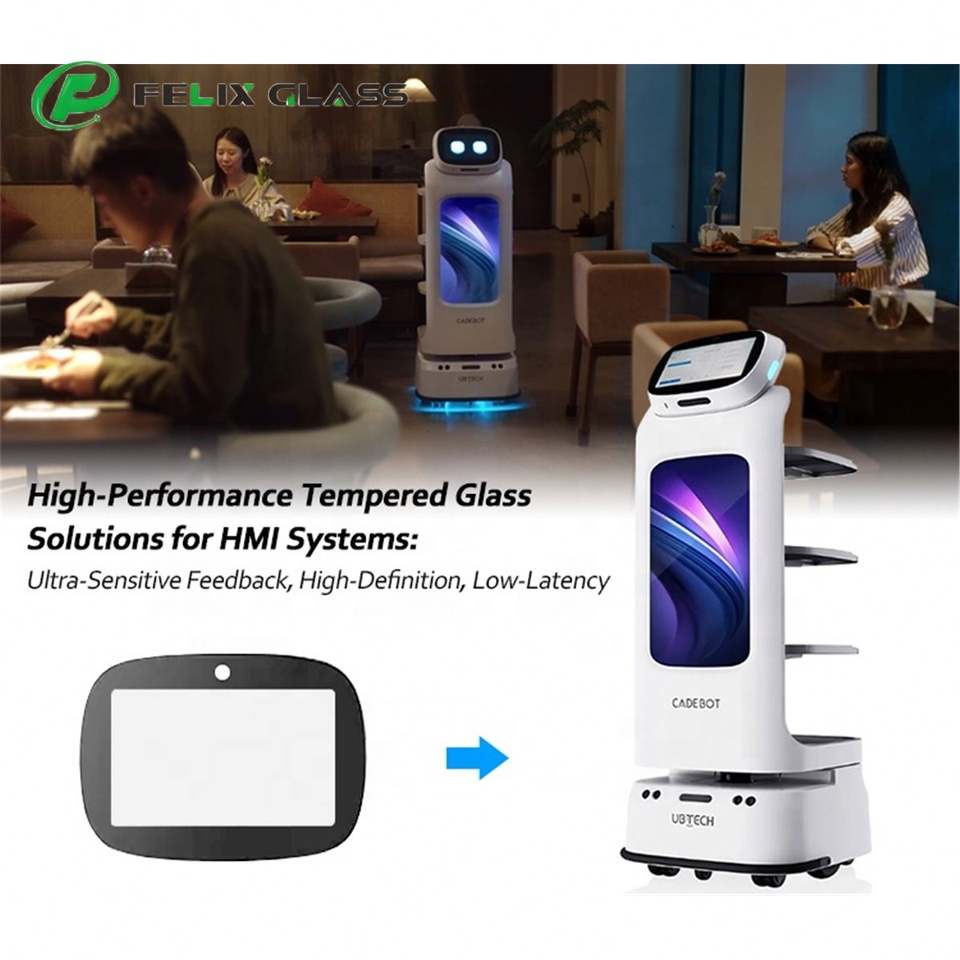 Verre trempé personnalisé pour écran LCD HMI de robot, dureté 9H, brillance 80%, anti-reflet, impression sérigraphique, structure solide pour usage industriel
