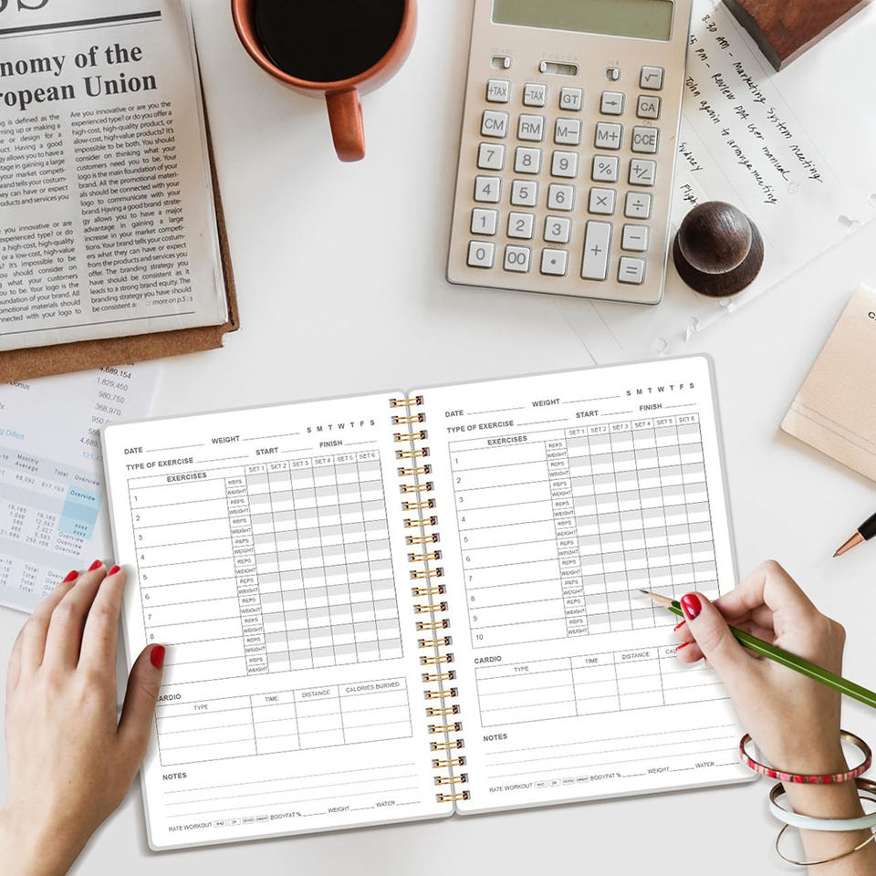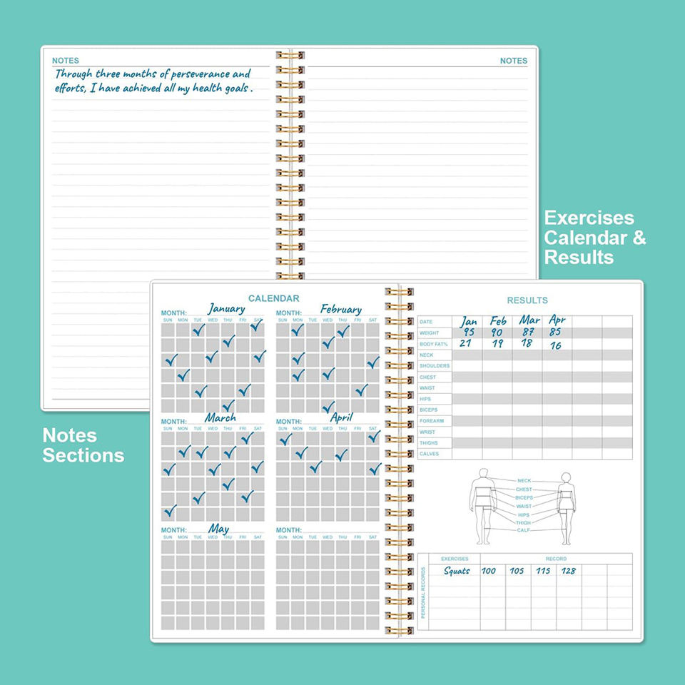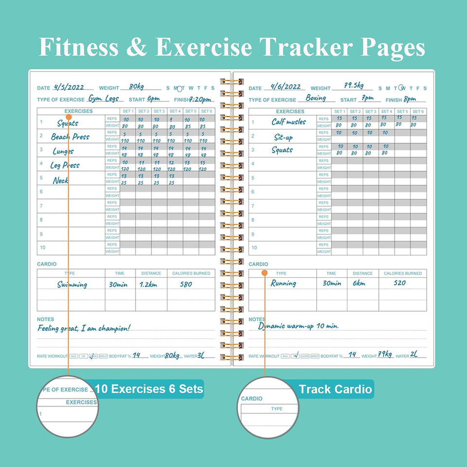 Agenda de sport personnalisé A5 imprimé, couverture rigide, style professionnel, organisateur à spirale, écologique, logo en feuille d'or, cadeau, entraînement