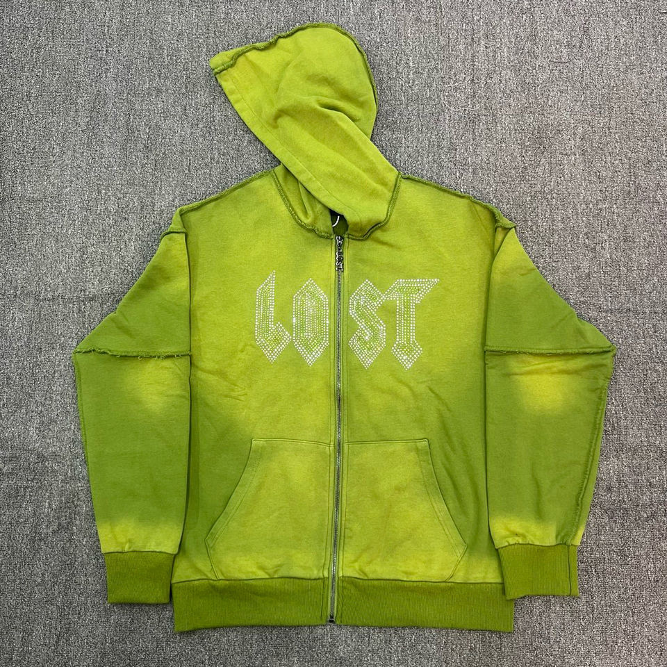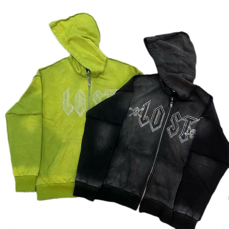 Sweat à capuche zippé pour homme en coton 100% délavé à l'acide, en molleton bouclette, avec strass, style vintage, couleur unie, col à capuche, haute qualité
