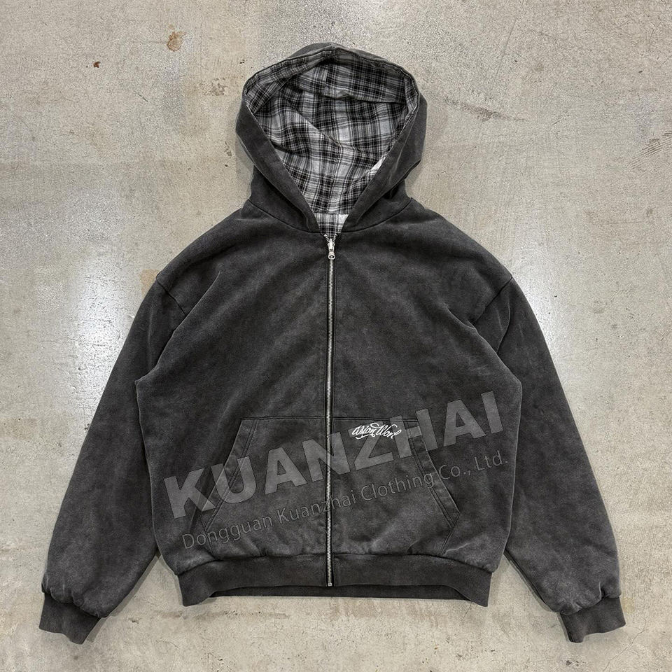 Veste zippée 100% coton éponge française brodée à l'acide personnalisée sweat à capuche à carreaux réversible double couche en flanelle rayée