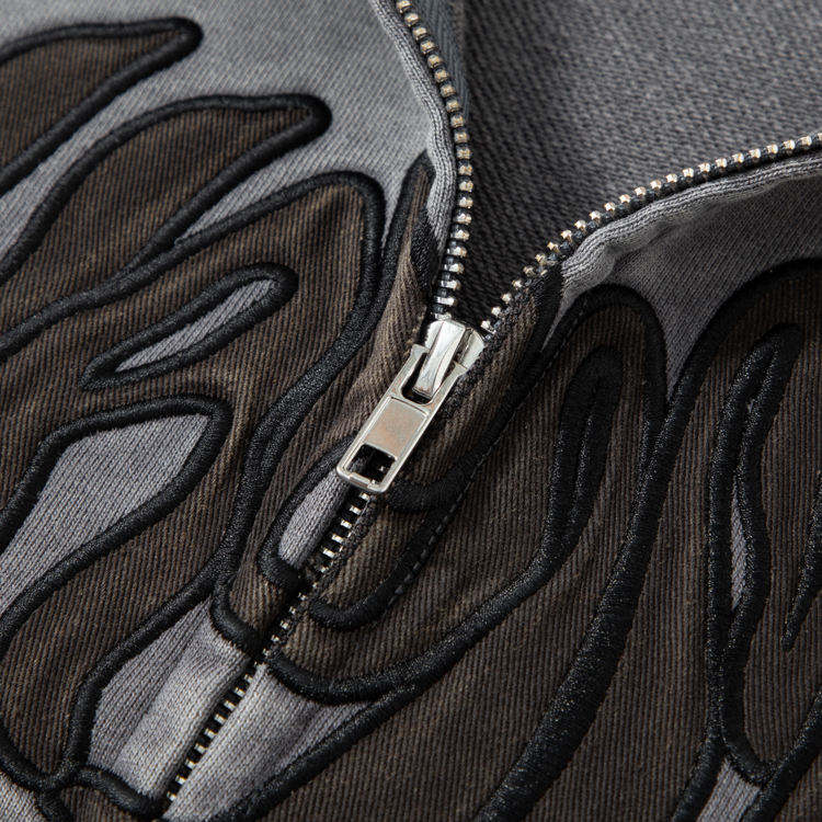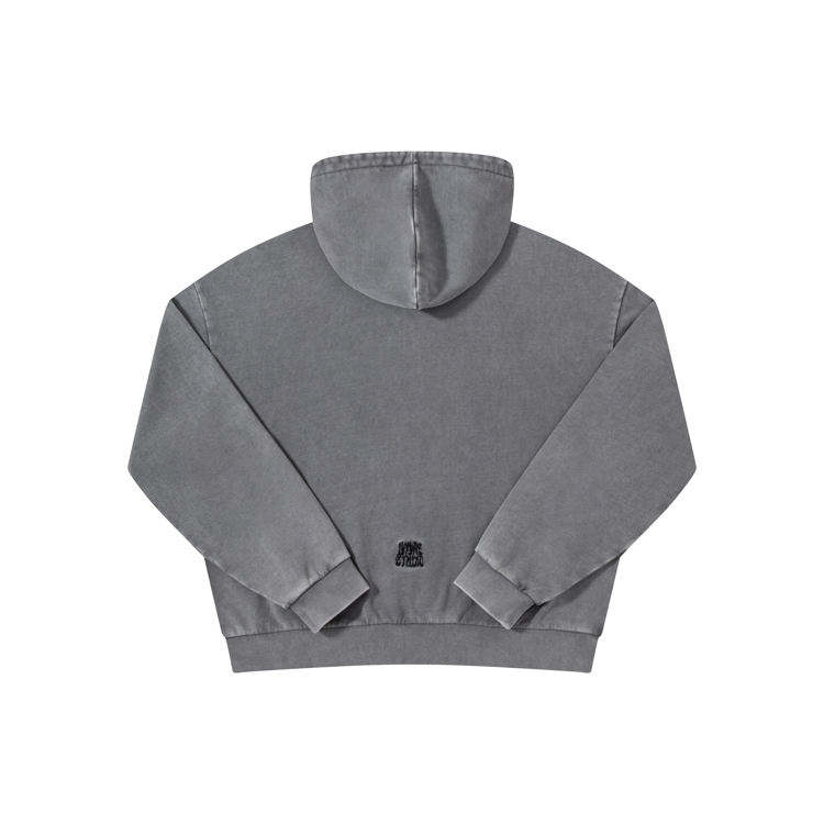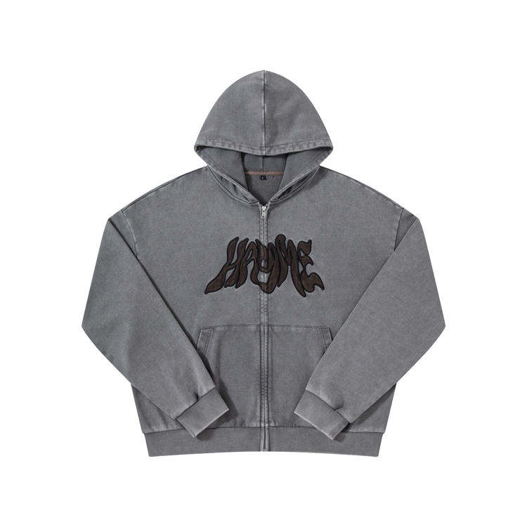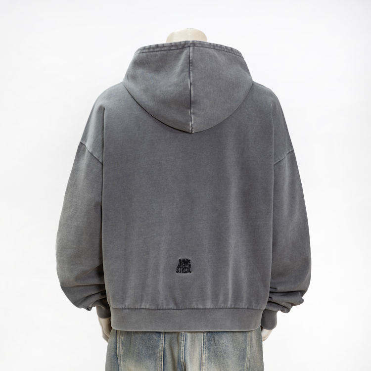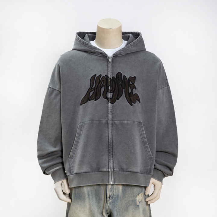 Veste streetwear pour homme en molleton français délavé à l'acide, coupe confortable, avec strass, style vintage et effet usé, fermeture éclair, à capuche