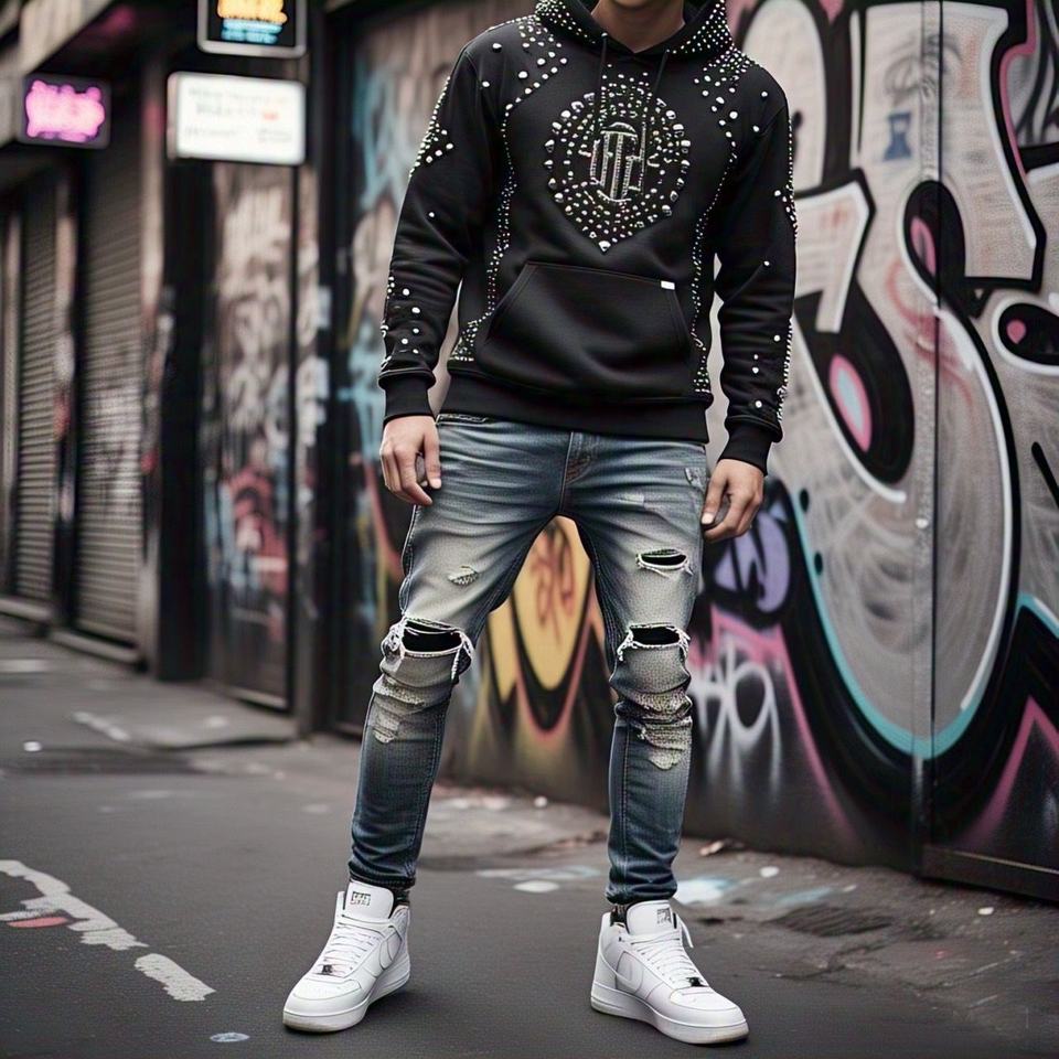 Sweat à capuche personnalisé pour homme lavé à l'acide de grande taille, épaule tombante, poids lourd 100% coton strass, poches cloutées personnalisables
