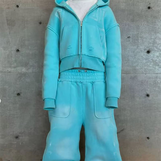 Ensemble de survêtement personnalisé délavé à l'acide pour pantalon de survêtement imprimé bouffant et sweat à capuche zippé sur le visage pantalon évasé respirant pour le jogging