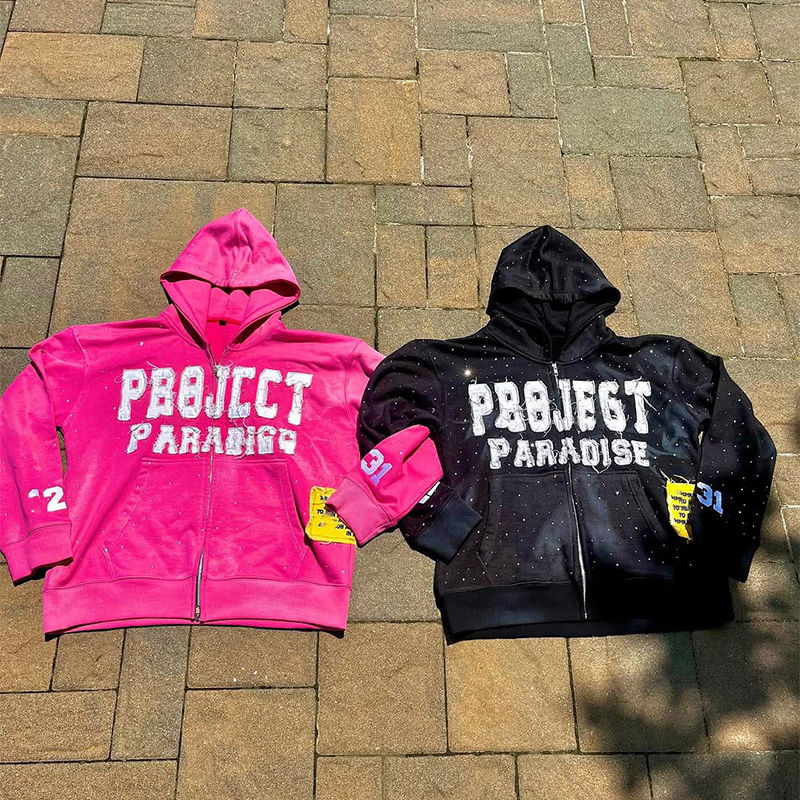Ensemble survêtement à capuche et pantalon de survêtement zippé en strass délavé à l'acide personnalisé survêtement Jogging Streetwear