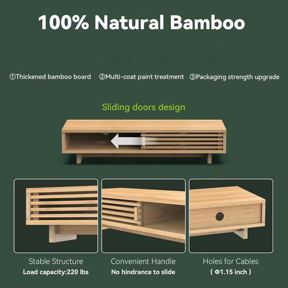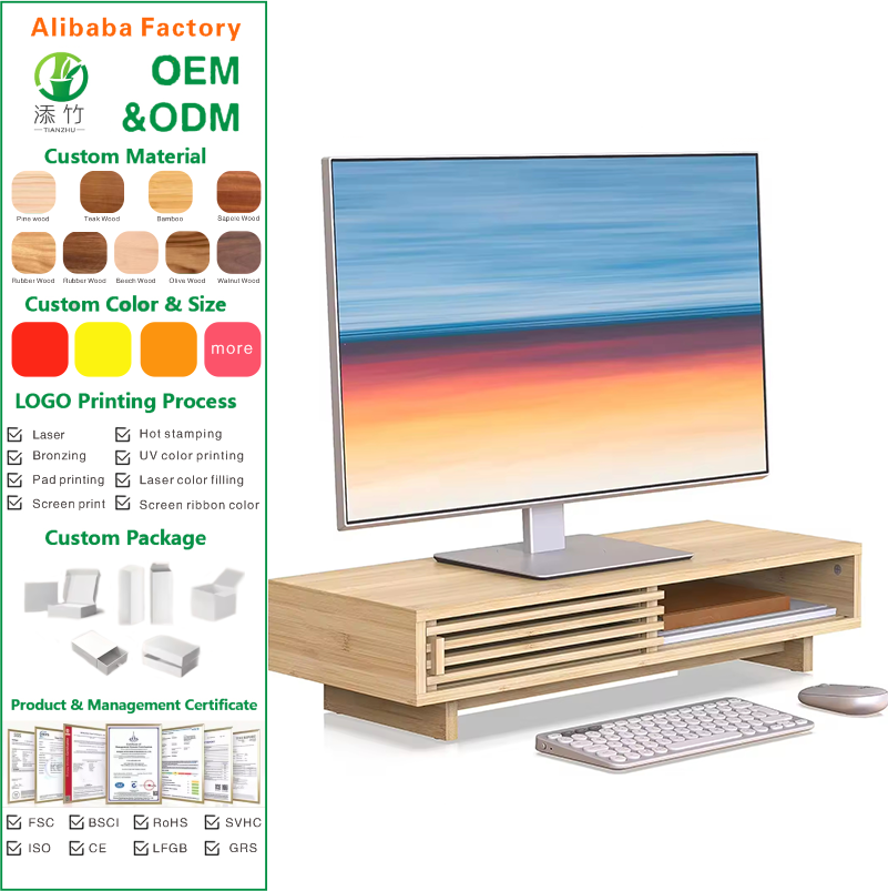 Support d'écran en bambou réglable sur mesure avec porte coulissante et espace de rangement pour le bureau à domicile (éco-responsable)