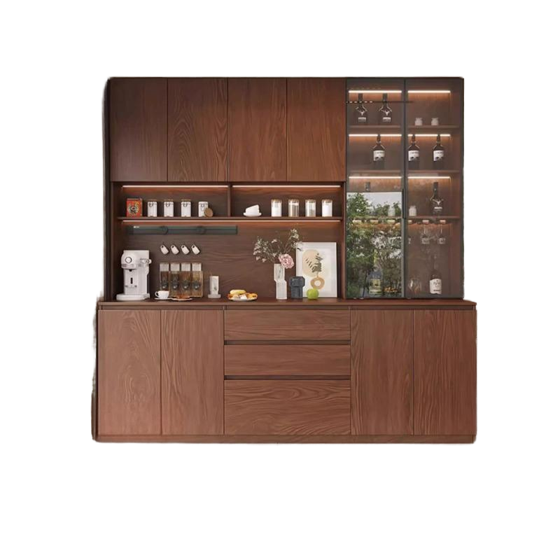 Meuble de bar tout-en-un sur mesure, finition grain de noyer, vitrine en verre avec tiroirs et plan de travail, mobilier de cuisine minimaliste