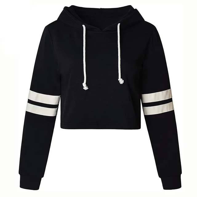 Vêtements sur mesure à rayures Top court à capuche pour femmes Pull-over Service OEM Logo des douanes Sweat-shirt à capuche Couleur noire recadrée