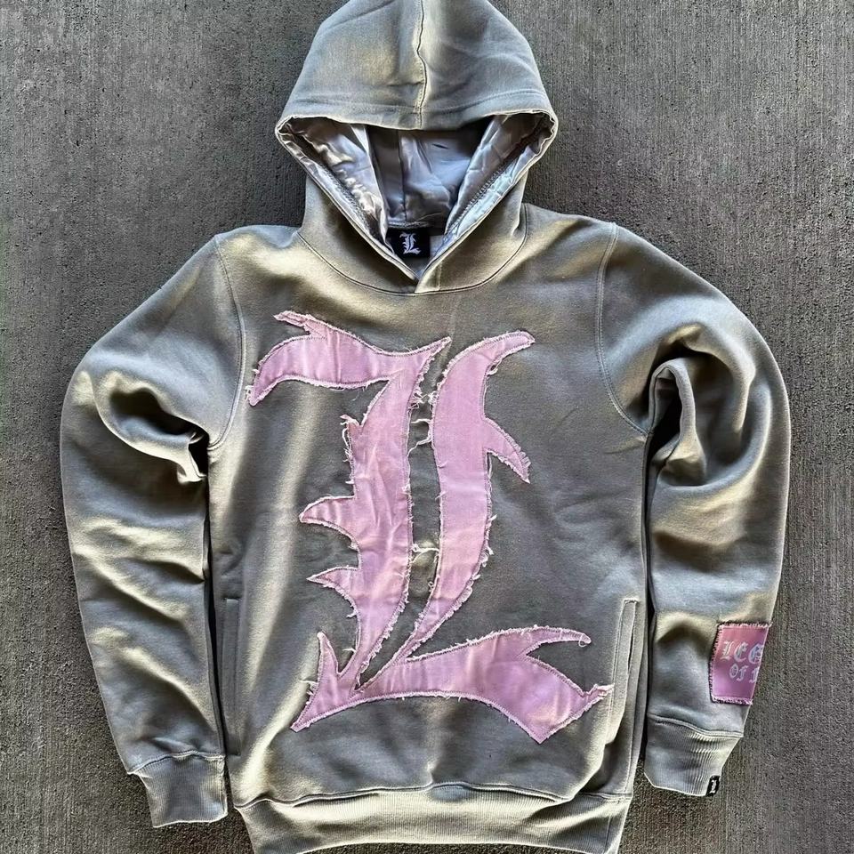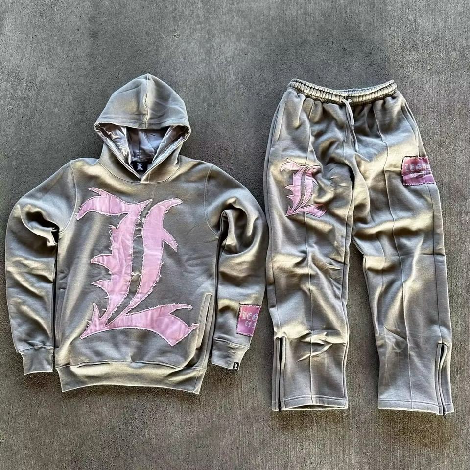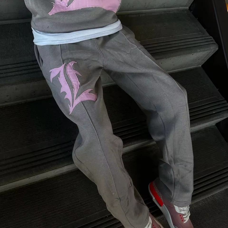 Ensemble de survêtement pour homme avec broderie personnalisée, effet délavé et décoloré, comprenant un sweat à capuche et un pantalon de jogging évasé