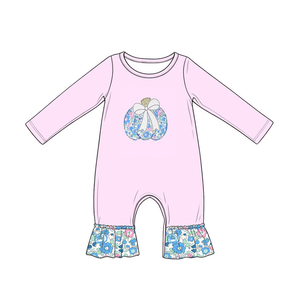 Combinaison bébé fille personnalisée en coton (95% coton, 5% élasthanne) avec imprimé floral et nœuds citrouille d'automne, vente en gros, vêtements pour nouveau-nés et sœurs