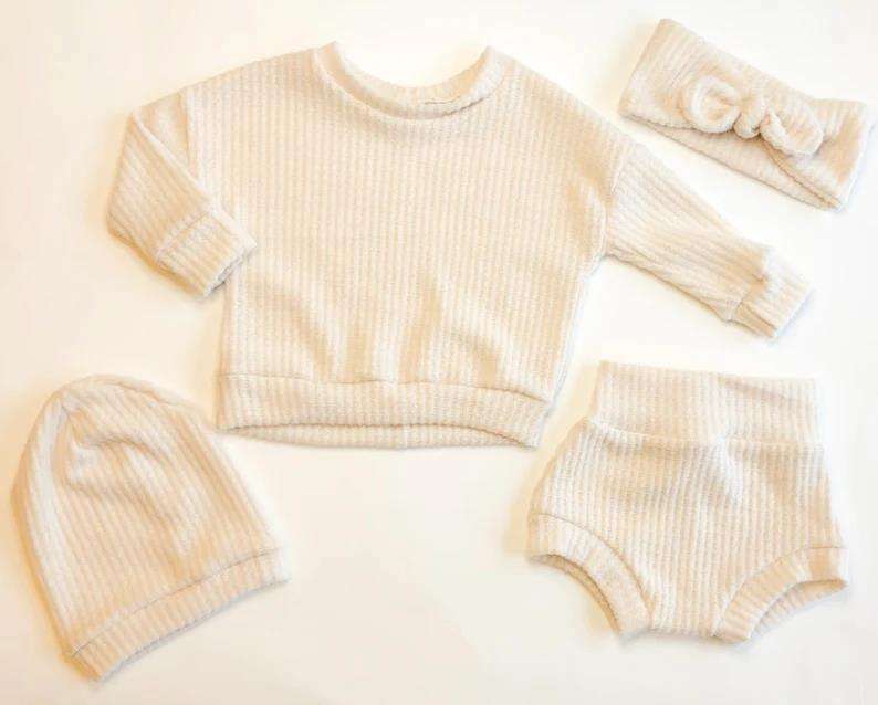 Ensemble de vêtements personnalisés pour bébé : ensemble gaufré pour bébés et enfants, comprenant un pantalon court, un pull oversize, un bonnet souple et un nœud.