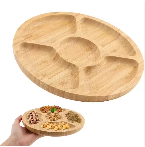 Plateau de service rond en bambou personnalisé avec 5 compartiments pour les aliments, les desserts, le buffet