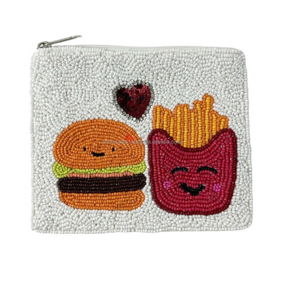 Custom Beaded Coin Pouch Burger and Fries Design Handmade Zipper Wallet for Women Gift Embroidery Clutch Bag Wholesale