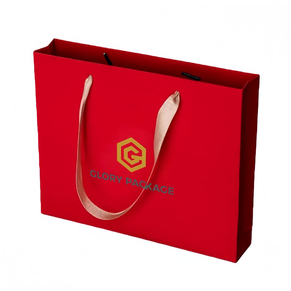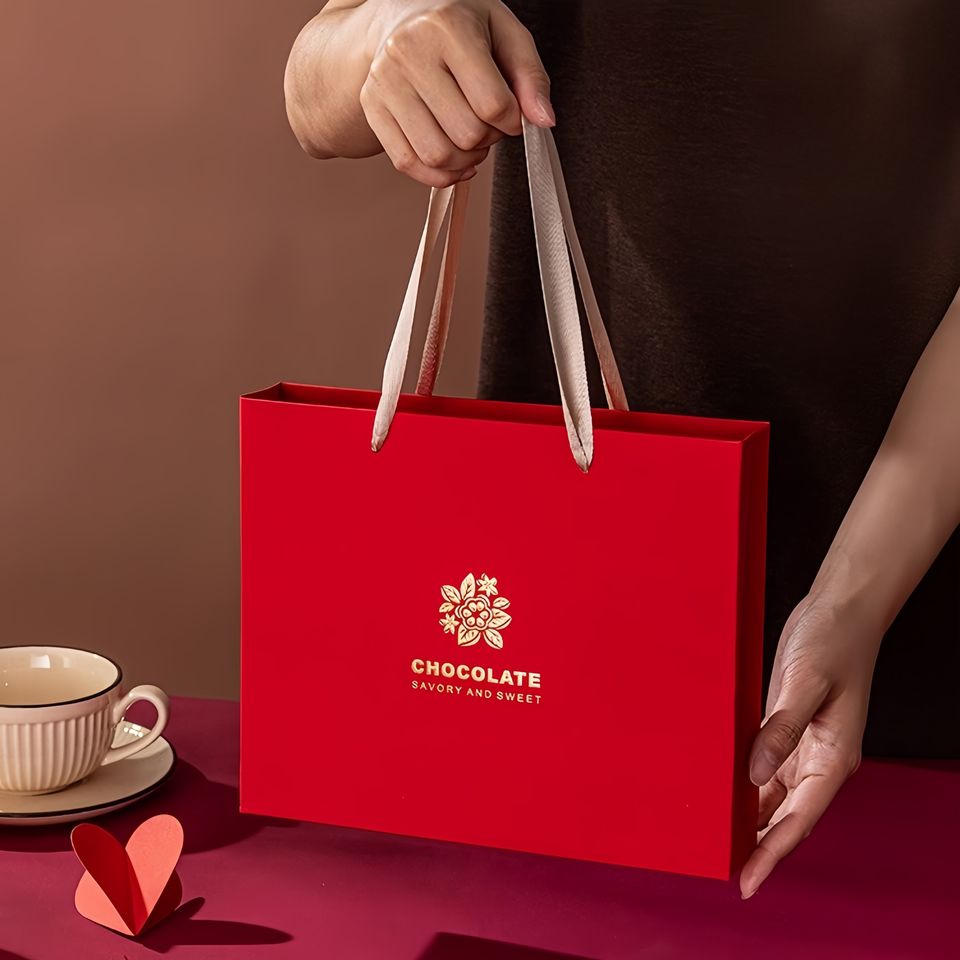 Sac cadeau rigide personnalisé biodégradable et écologique, rouge, avec lamination douce au toucher, poignée en ruban, emballage pour boîtes de chocolat
