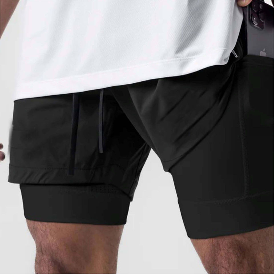 Short de gymnastique 2 en 1 uni noir personnalisé Short d'entraînement pour homme à doublure de compression léger à séchage rapide avec poches zippées